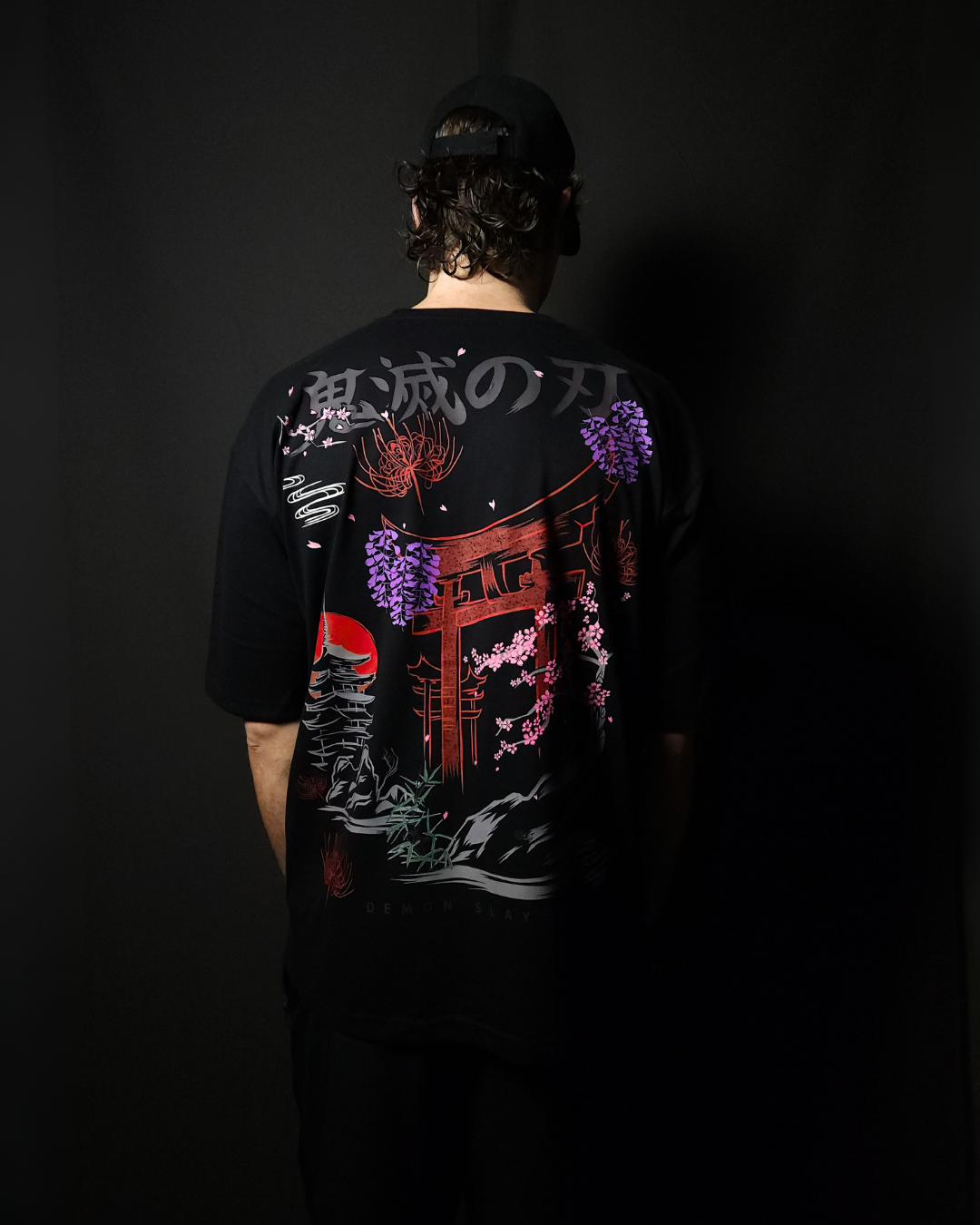 Anime-inspired apparel featuring bold back artwork, worn by a model in a dark studio setting – from a South African anime clothing brand.